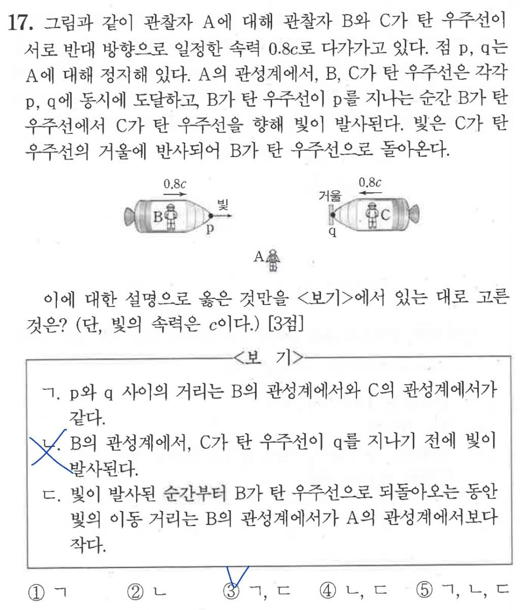 오른쪽 사건이 먼저라서 c가 탄 우주선이 먼저도착이라고 합니다