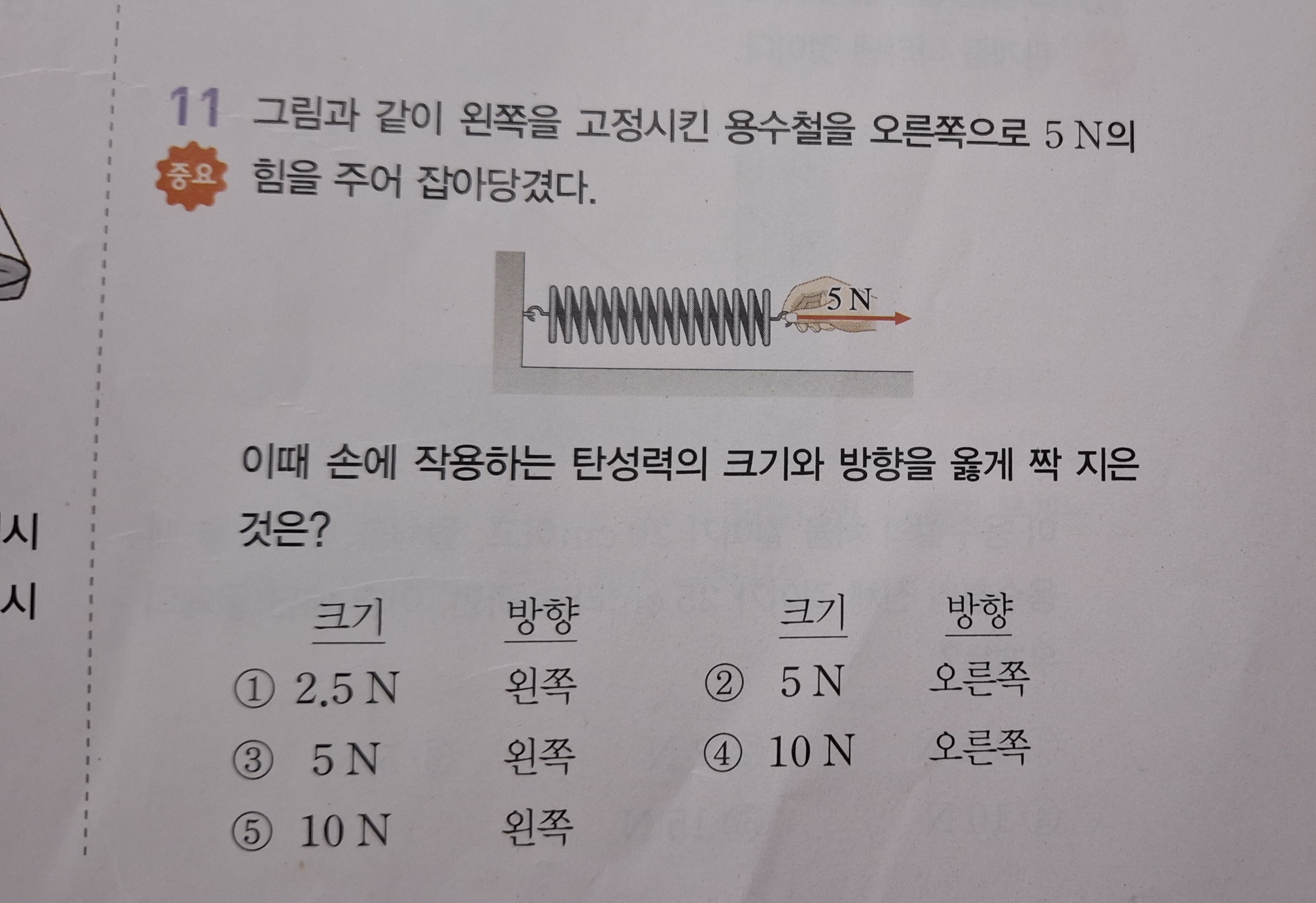 만일 용수철이 오른쪽으로 당겨지고있는 경우라면 탄성력이 5N 보다 작아야 오른쪽으로 당겨지는게 맞을텐데요. 선생님들 보시기엔 어떠신가요?