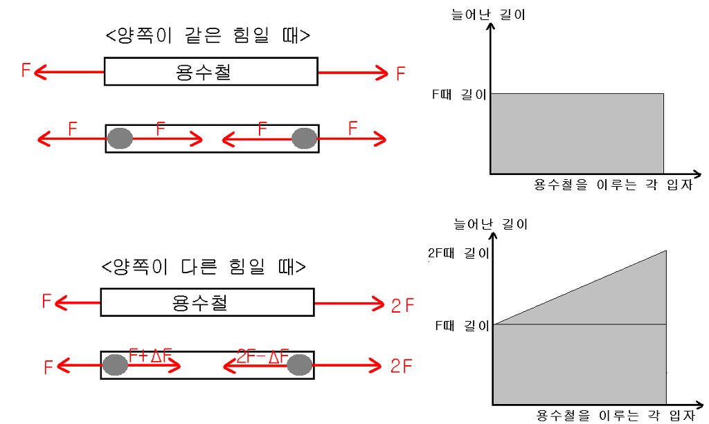 양쪽에 같은 힘이 가해졌을 경우와 다른 힘이 가해졌을 경우를 각각 생각하여 보았습니다. (아래 그림 참고)