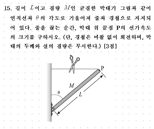 막대가 받는 토크는 0.5MgL sin theta 입니다. 각가속도는 α = (0.5MgL sin theta) / (1/3 ML^2)... 그러므로 P의 선가속도는 Lα = 1.5g sin theta 인 것 같군요...