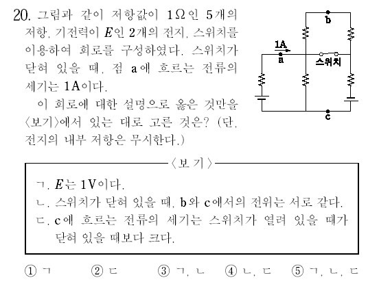 작성자카이퍼 작성시간 09.11.19 가운데 사거리를 기준으로 했을 때 스위치가 닫혀 있으면 b쪽과 아래쪽 저항으로는 전류가 흐르지 않으니까 전위가 0이고 c로 가는 동안 저항을 통과하면서 전압강하 -1, 전지를 통과하면서 +1이므로 c에서 전위는 역시 1입니다. 그래서 b와 c는 전위가 같습니다.