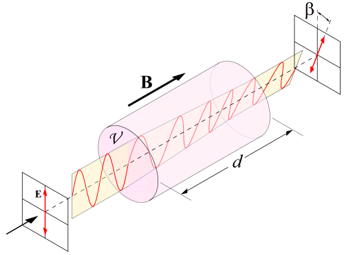 1845년 영국의 물리학자 마이클 패러데이에 의해 패러데이 효과라는 것이 발견됩니다. 선편광된 빛이 빛의 진행방향과 나란하게 자기장이 걸린 유전체를 통과할 때 편광면이 진행방향에 대해 회전하는 현상이 발견되었던 것입니다.(아래 그림 참고)