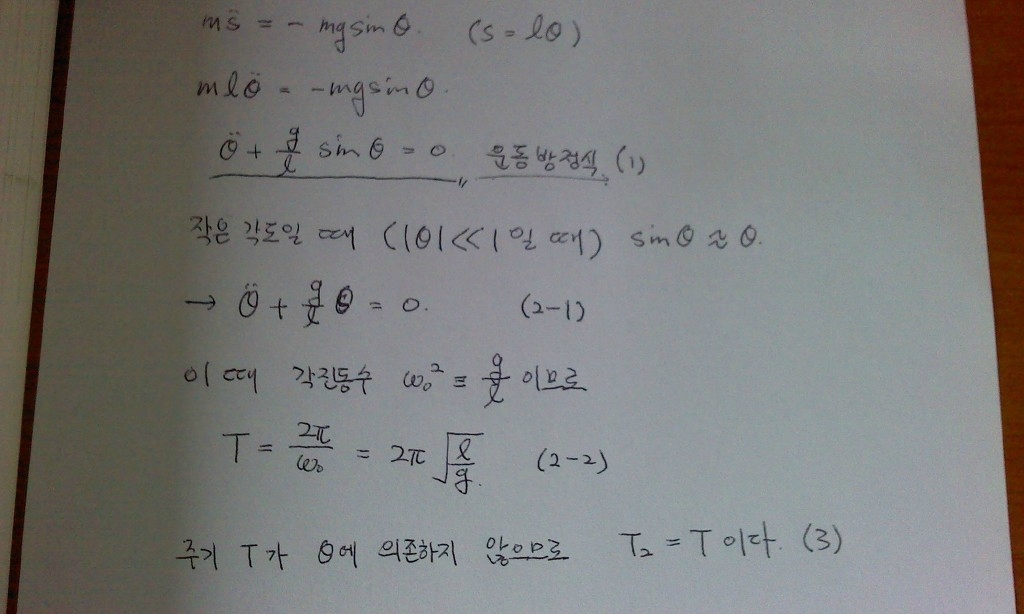(3) 전개과정에서 알 수 있듯이 주기가 θ와는 관계가 없고 줄의 길이 l 과 중력가속도 g에만 의존을 합니다.