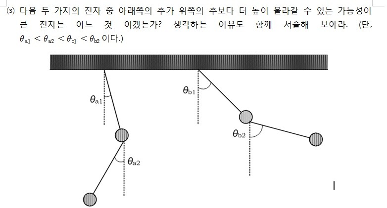 • 작성자00 릴라~! | 작성시간 12.06.08 오른쪽인 것 같습니다.......두개가 똑같은 이중 진자라면 가질 수 있는 상태(에너지레벨)는 정해져 있을 것이며........그중 아래쪽 진자가 위의 진자보다 위로 갈 상태를 가지려면......즉, 더 많은 경우의 수를 가지려면.....에너지가 많은 상황이 경우의수가 많기에....오른쪽이 그럴 가능성이 더 크다는 것이죠....물론 아래쪽 진자가 위쪽 진자보다 위로 무조건 올라갈 것이라는 것은 표현을 못하죠...문제에서 나온 것 처럼 가능성이 더 높습니다...