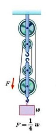 그런데 만약 첫번째 그림처럼 아래쪽 작은 도르래를 감은 실이 위쪽 작은 도르래의 걸쇠에 연결되어 있는거라면 1/4이 맞습니다.