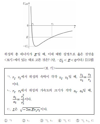 보기 ㄱ에서 위성의 속력이 각각 위치에서 v=L/mr 이 나오잖아요.