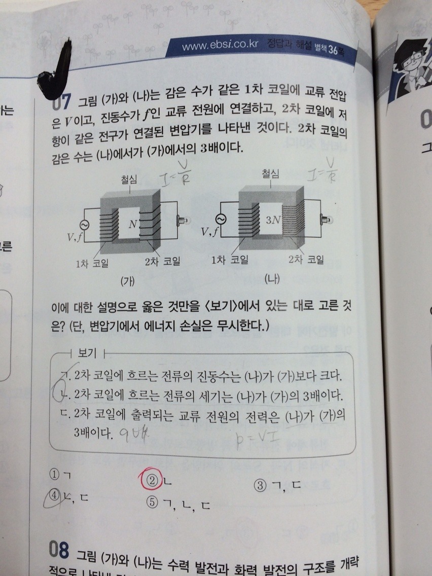 전력비는 1:1 이라고 했는데, 뭐가 잘못됐는지 모르겠어요.... (가)와 (나) 각각 1차 코일에서 입력 전력도 똑같잖아요...