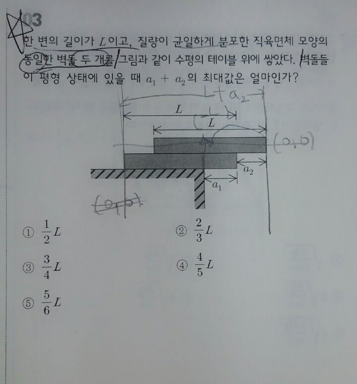 작성자2016물리 작성시간 15.03.06 누르는 힘과의 토크적 평형만 계산하면 되는데 위의 물체가 누르는 힘은 mg고 아래 물체에 작용하는 중력 역시 mg이므로 아래 물체가 최대로 회전하기 직전에 위치할수 있는 거리는 L/4가 됩니다. 그래서 위의 물테는 L/2이고 아래 물체는 L/4가 되므로 이를 합하면 3L/4가 되겠네요