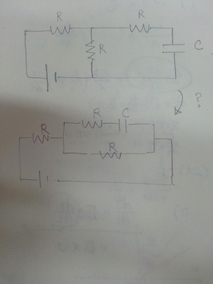 위의 회로를 단순하게 재배열하면 아래와 같이 되는 것 맞나요?? 그리고 이 회로를 충전되는 전하량 Q와 t사이의 관계식으로 유도하는 방법은 일반물리에서는 다루지 않나요?? RC직렬회로에서 키르히호프법칙으로 유도하는건 있는데, 직렬병렬 혼합 RC충전에 관련된 내용은 없는 것 같아서요 ㅜㅜ