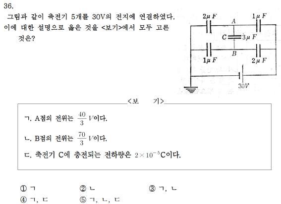 답댓글 작성자1mll 작성시간 15.08.05 마지막이다. 전 그냥 변형이라기 보다 등전위, 충전되는 전하를 이용했는데 일단 1마이크로패럿 축전기를 C1, 2마이크로패럿 축전기를 C2, 3마이크로패럿 축전기를 C3로 잡을게요. 지금 전지에서 나오는 부분에서 시작하면(30V 전지에서 +극) C1(Right)과 C2(Right)에 전하가 쌓여요. 각 축전기 오른쪽 극판에 쌓이는 전하를 (+Q1, +Q2)라 둘수 있겠지요, 그리고 이때 C1과 C2는 도선으로 연결되어 있으므로 전위가 같겠지요. 이에 Q2>Q1 을 알수 있습니다. (V=Q/C이니) 이와 똑같이 이번엔 전지의 -부분에서 생각하면 왼쪽에 있는 C1(Left), C2(Left)의 왼쪽 극판에는 (-Q1, -Q2)라 두면 되겠지요.
