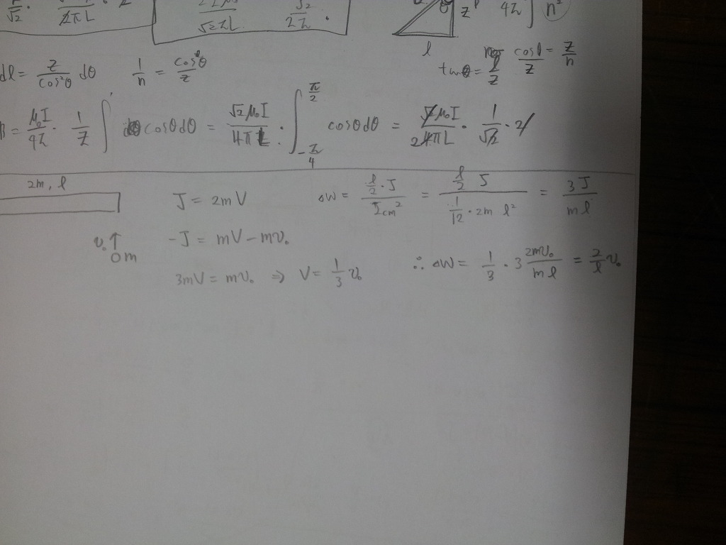 문제상황이 질량이 m인 물체가 질량이 2m이고 길이가 l인 막대 한쪽 끝을 때리는데 충돌이후에는 같이 붙어서 움직이는 상황입니다. 각운동량의 변화량을 구했는데 어떤부분이 틀렸는지 궁금하네요.. 제가 생각하는 답은 2v/l 이 아니라 v/l인것 같습니다