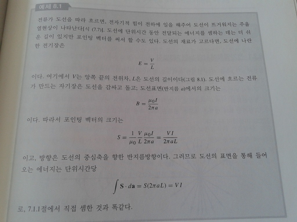 사진의 식 8.11은 예제와 같은 챕터에 있는 줄열(dW/dt = ∫ JㆍE dV)과 전자기 에너지 변화율(∂U/∂t), 포인팅 벡터(∫ ▽ㆍS dV) 관계식입니다.이미지 확대