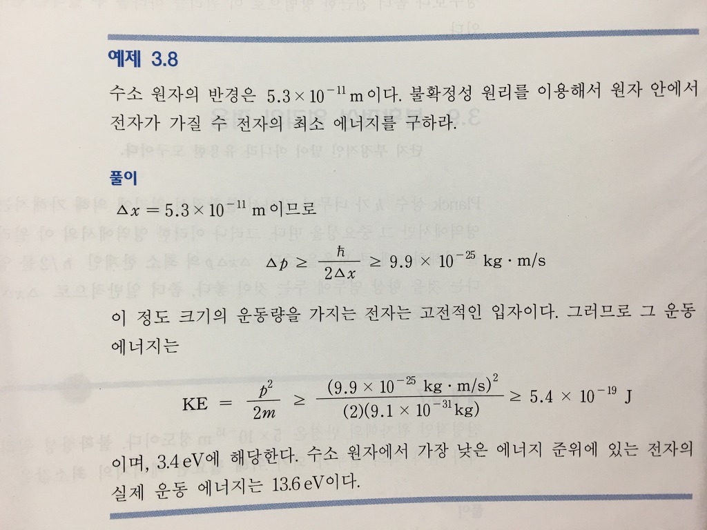 답댓글 작성자스키즈 작성시간 16.07.22 수능에서 운동에너지라고 했을리가 없을 듯하네요. 물리1 교과서에서도 운동에너지와 위치에너지의 합이라고 나와 있으니까요. 문제의 풀이 과정을 잘보면 수소정도의 아주 좁은 자유 공간에 갇혀 있는 전자의 에너지를 구하는 것으로 해석할 수 있을 듯 하네요. 그리고 위치에너지를 고려하면 에너지는 계산한 에너지의 반이 될 텐데요. 불확정성 원리에서 하바를 쓰는 책도 있고 그냥 플랑크 상수를 쓰는 책도 있습니다. 2배 차이 나는 것은 중요하지 않습니다.