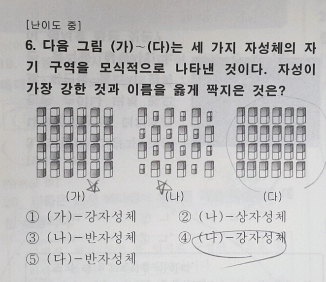 따라서 정확히 모두 상쇄가 되는건 입자 원자 궤도운동의 방향 무질서에 의한 반자성체일 것이며, 어느정도 지워지는건 스핀 운동, 자구간의 영향 의해 자기장이 없어도 자성을 유지하는건 (다) 강자성체라 할 수 있겠네요.