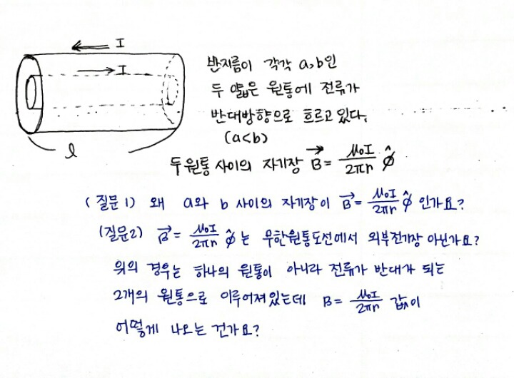 답댓글 작성자운좋은올빼미 작성시간 17.10.27 Lovely Alice 가는 두 도선이 아니라 두 원통인 상황이에요. 바깥쪽 원통 표면에 전류가 골고루 분포해서 흐르기 때문에 좀 다른 상황이랍니다. 그리피스책 찾아보시면 도움이 될꺼에요 ~