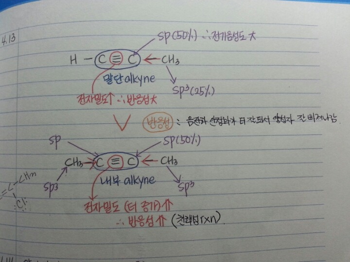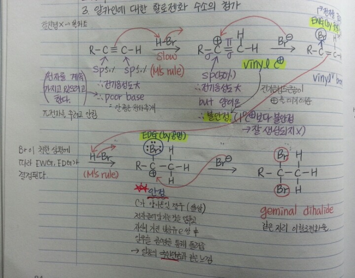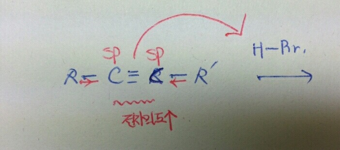 근데 여기 알카인에대한 할로젠화수소의 첨가 부분을 보면 첫번째 반응인 알카인의 파이 전자가 HBr의 수소를 떼어먹는 과정은 어렵다고 하더라구요. 그 이유가 삼중결합한 탄소는 sp혼성이라서 파이전자를 잘 주지 않는다고 하시더라구요.