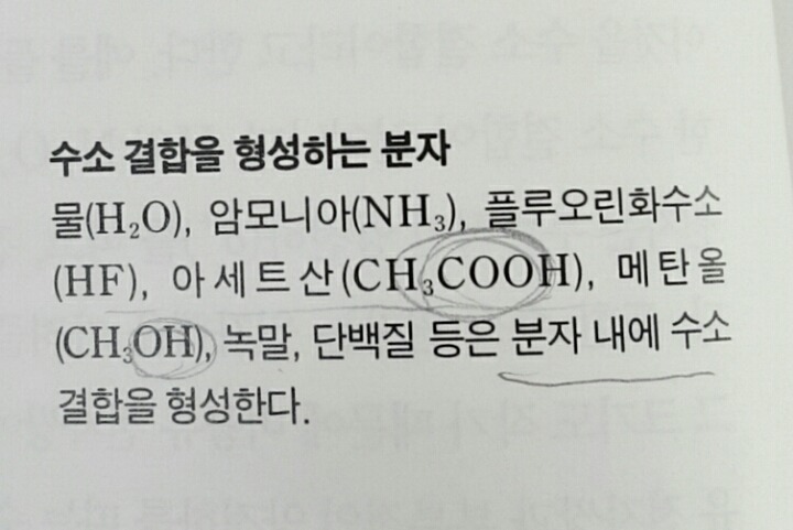 단순한 구조인 물, 암모니아, 플루오린화수소, 아세트산, 메탄올 등은 분자간 수소결합 아닌가요?