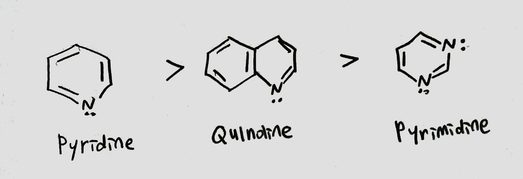 작성자kkikana 작성시간 17.03.15 pyrimidine의 경우에는 모든 전자가 벤젠고리에 포함되어 공명을 이루기 때문에 염기도가 떨어지는게 아닌가 싶어요