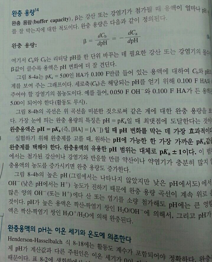 강산이나 강염기가 첨가될때 용액이 얼마나 pH변화를 잘 막는지에 대한 척도라고돼있구요
