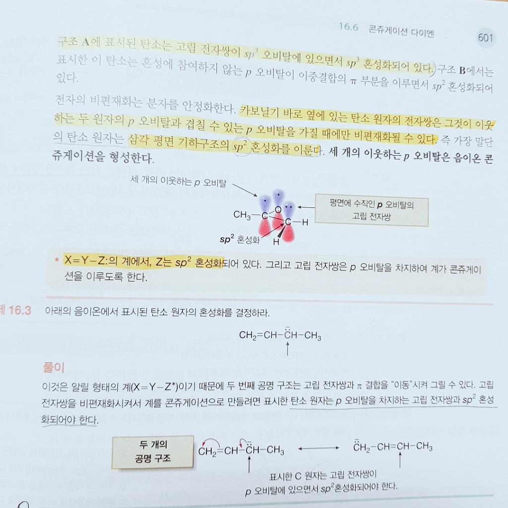 답댓글 작성자굿니스 작성시간 18.05.21 2019합격자 저렇게 설명하는 그림이 없다면 sp3이라고 볼 수 있지만, 저 그림에서는sp3을 sp2와 p로 분리시키고 비공유전자쌍을 p궤도에 있는 상태로 설명하고 있기 때문에 sp2로 봐야합니다. 설명을 위한거지 혹시나 문제로 나온다면 탄소음이온은 sp3으로 보고 이중결합이 있다면 sp2로 보면 될 것 같아요~