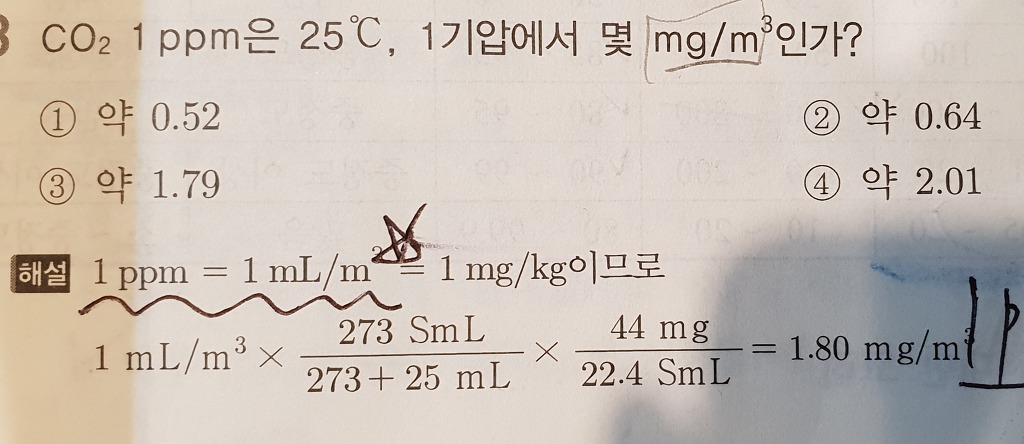 [질문](일반화학)ppm 농도계산 질문 작성자18화학|작성시간18.10.14|조회수442 목록 댓글 1 글자크기 작게가 글자크기 크게가 풀이를 봐도... 차근차근 설명해주실 선생님 계신가요?ㅜㅜ 다음검색 현재 게시글 추가 기능 열기 북마크 공유하기 신고 센터로 신고 댓글 댓글 1 댓글쓰기 답글쓰기 댓글 리스트 작성자오통다리 | 작성시간 18.10.15 기체 혼합물에서 ppm은 10^-6 V/V를 사용합니다. 1ppm은 1 m^3(1000L)의 기체 혼합물에서 1mL만큼의 부피에 해당하므로1mL의 CO_2 질량은 이상기체상태방정식으로부터w = PVM/RT = (1기압×1mL×44g/몰)/(0.082L•기압/몰•K×298K) = 1.77mg이다.이렇게 풀어야할것같습니다.0℃, 1기압에서 몰부피 22.4L를 이용해서 푸는걸로 되어있는데 풀이가 불친절하네요.^^ 댓글 전체보기
