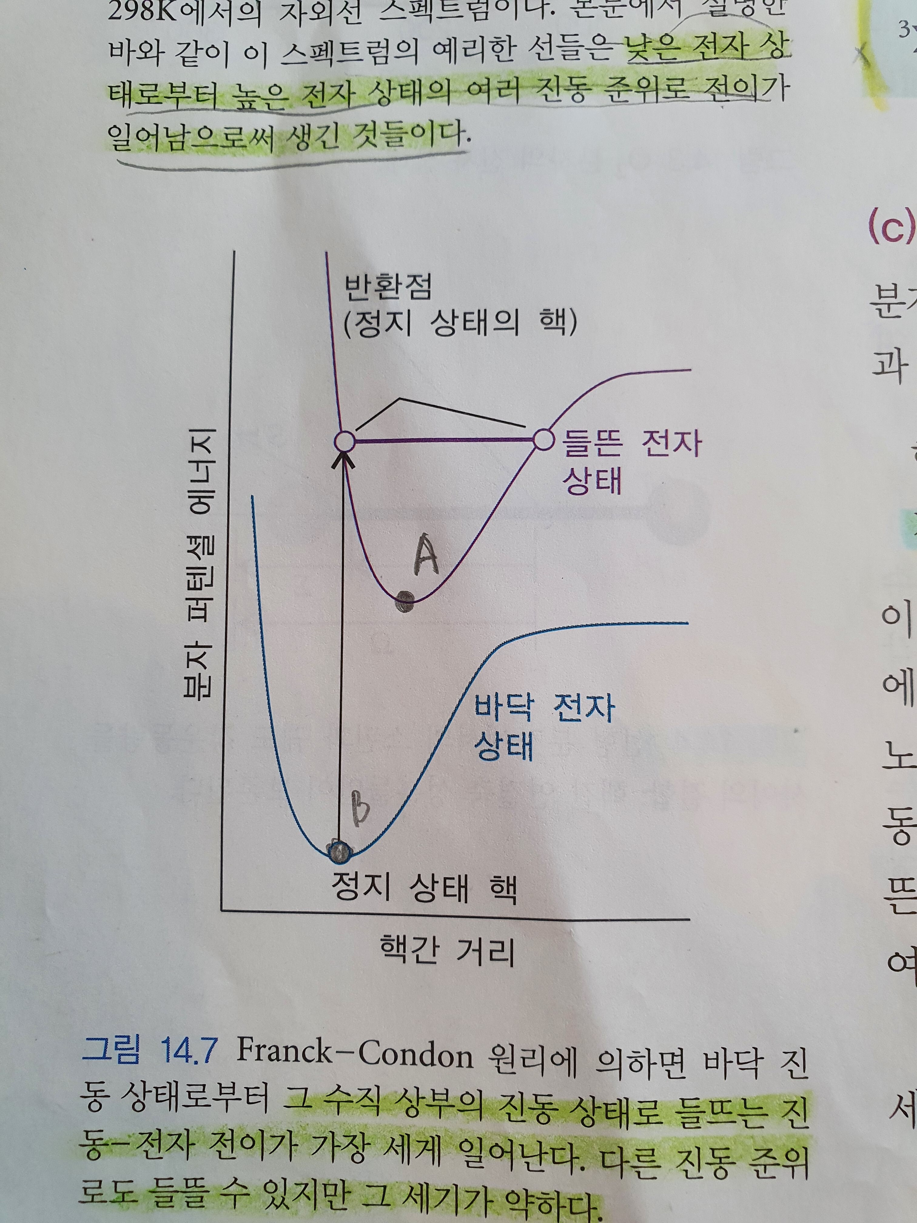 그림에서 보면 저는 바닥상태 전자상태의 포텐셜에너지가 가장 낮은 곳과 들뜬 상태의 전자 상태의 포텐셜에너지 가장 낮은 곳이 일치해야할거같은데... 이렇게 약간 어긋나 잇는 이유가 잇나요? 이게 어긋난 이유가 궁금합니다. 급속한 전자 들뜸때문에 핵의 위치가 조금 변해서 그런가요..? ㅠㅠ