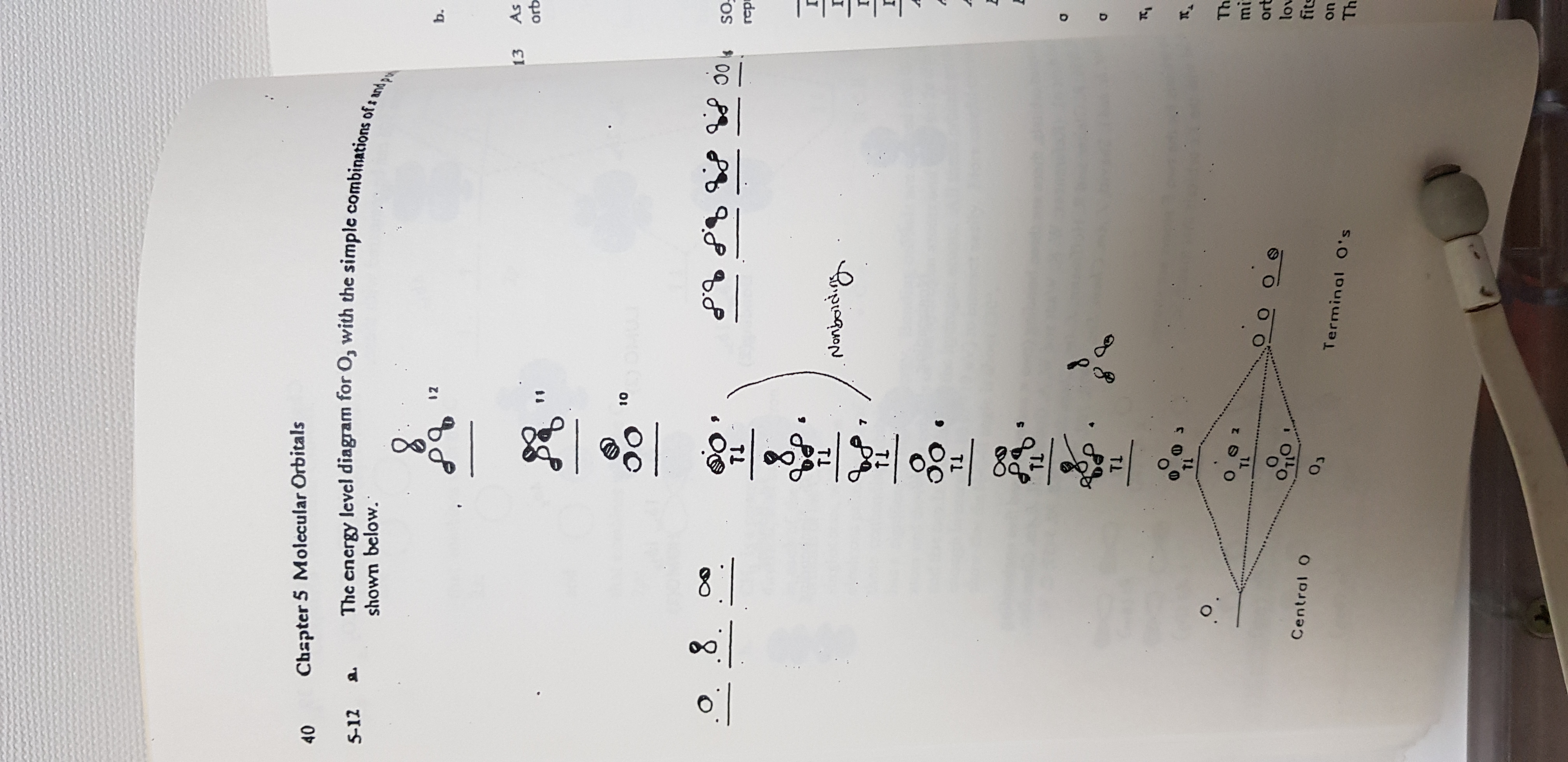 A: 음,, 제가 이해한 바로는, 선생님은 p오비탈 세 개로 구성된 분자오비탈은, 구성된 오비탈이 세 개니깐 방이 세 칸이라서 전자가 6개 채워지는 거로 생각하시는 거 같은데,,,, 원자 오비탈이 몇 개가 됐든, 그것들끼리 상호작용해서 새로 생성된 분자오비탈은, 그냥 오비탈 1개로 보는거예요. 그래서 지금 O3는 1번부터 12번까지 총 12개의 분자 오비탈이 만들어진거고, 그래서 이 분자는 방이 12개 인 거예요