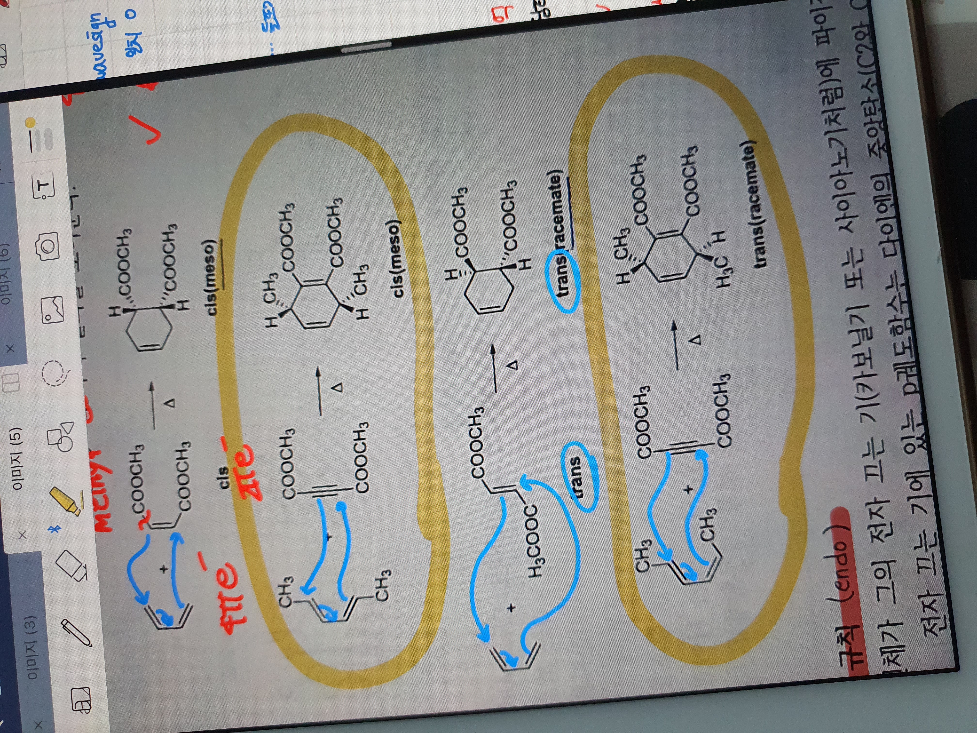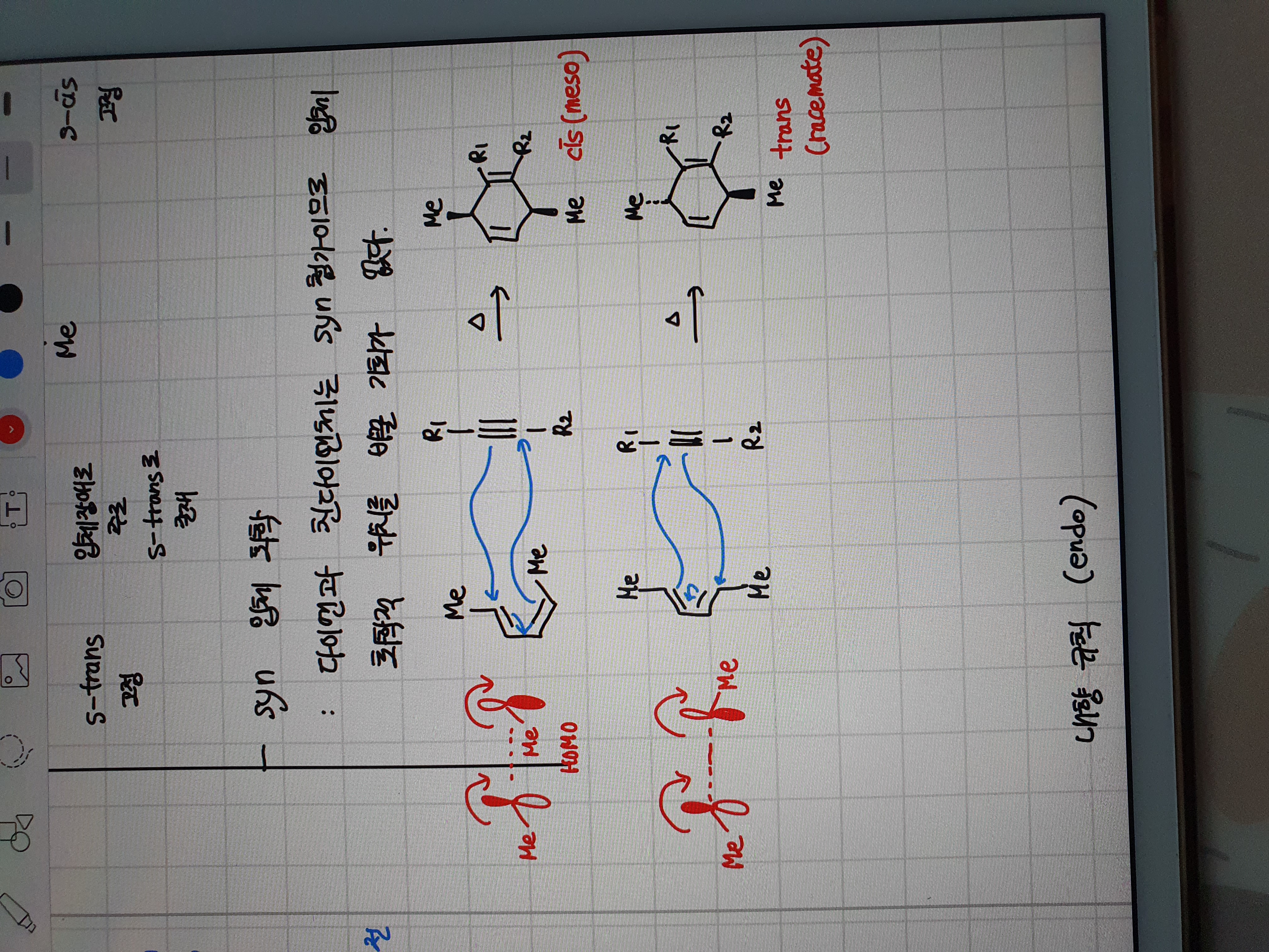 작성자힘을내라고! 작성시간 21.05.23 Diels-Alder 전자 고리화 반응은 고리 닫힘 반응과 달리 다이엔과 친다이엔체의 HOMO-LUMO겹침에 의해서 일어납니다. 그러므로 선생님이 경계오비탈을 가진 탄소를 돌려 그리신 것처럼 되지 않고 그대로 겹침이 일어납니다. 고리화가 일어났을 때 다이엔과 첸다이엔체의 입체화학은 바뀌지 않습니다.