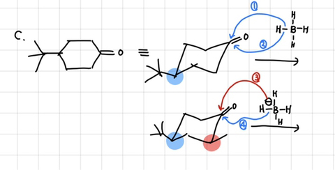 책에 나온 문제는 윗쪽 반응인데 제가 생각했던것은 t-butyl기가 steric이 크기 때문에 수소 음이온이 평면 밑쪽 방향으로 반응이 진행되어야 한다고 생각했는데
