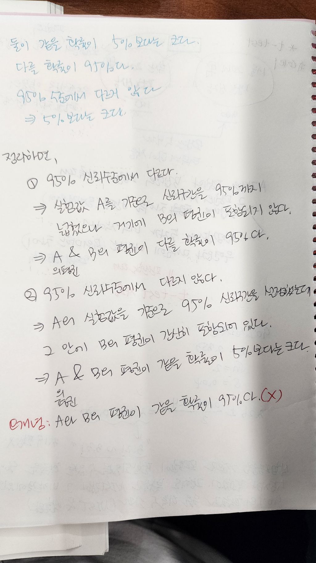 근데 오개념이 평균이 같을 확률이 95프로다 하면 틀린거라고 하셔서요