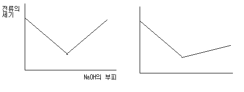 작성자교사는 나의 길? 작성시간 09.01.17 정확한 그래프는 두번째가 맞지만 대부분 화학1에서는 첫번째 그래프형태로 나옵니다. 그리고 중화점이전 전류의 세기가 감소하는 것은 이온농도 감소때문이 아니라(이온농도는 일정합니다.) 전기전도도의 크기가 수소이온>수산화이온>기타이온들이기 때문입니다. 상대적으로 전기전도도가 큰 수소이온이 없어지고 전기전도도가 더 약한 나트륨이온이 첨가되니 이온수가 같아도 전류의 세기가 약해지는 것이죠.