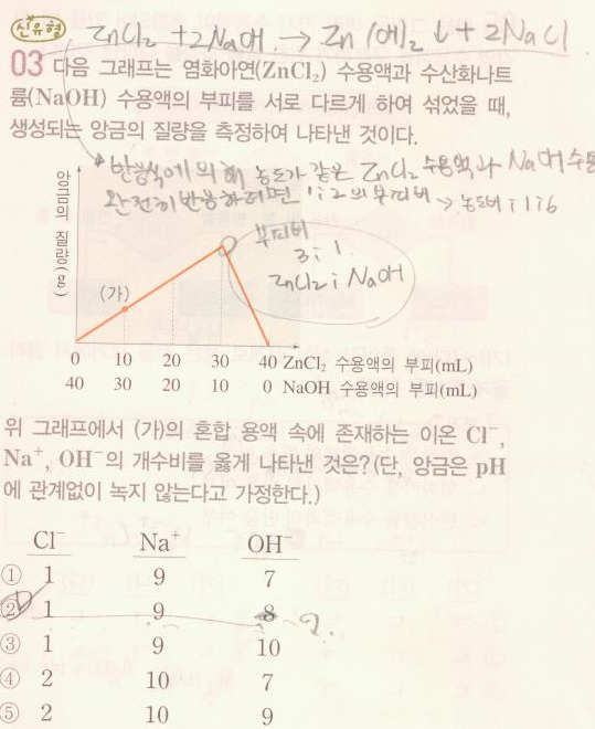 염화아연수용액과 수산화나트륨수용액부피를 다르게 하면서 섞을때