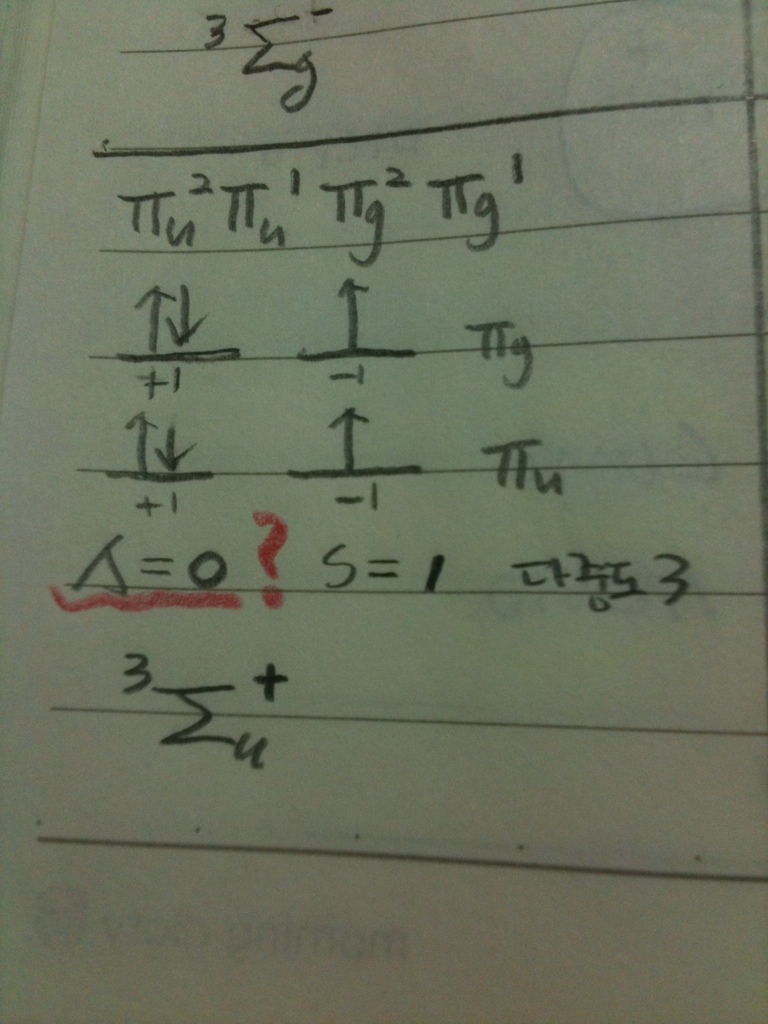 위사진은 산소분자의 분자궤도함수인데요 들뜬상태에서의 항기호를결정해야하는데 대문자 람다가 왜 0인지를모르겠어요ㅜㅜ대문자람다의값은 분자속에들어있는 개개 전자들에대한 소문자람다의값을 합하여 정하는걸로알고있는데 그럼