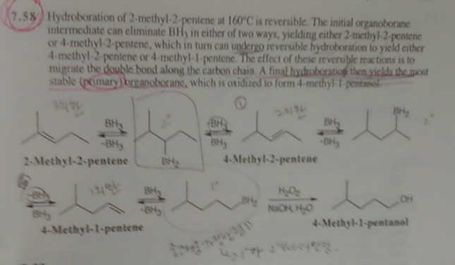 3. 그리고 보레인 첨가했을때 알켄이 총 세 종류가 나오는데요. Zaitsev규칙에 따르면 원래 반응물이 가장 안정한데......이 반응에선 1치환된 4-methyl-1-pentane까지 나와서 거기에 보레인이 첨가가 되네요ㅠ.ㅠ...이게 나올수야 있겠지만 상대적으로 그 양은 3치환이나 2치환된 알켄보다 적지않을가요??1치환 알켄에 보레인 첨가시켜 산화시켜 1차 알코올을 만들었다는게.......가능은 하겠지만 1차 알코올이 major는 아닌데 이걸 생성물이라고 할 수 있는건지........ㅡㅡ;;