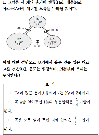 돌턴의 분압법칙 작성자맑은뒤흐림|작성시간12.05.11|조회수984 목록 댓글 1 글자크기 작게가 글자크기 크게가 보기에서 ㄴ만 정답인데 ㄱ, ㄷ은 왜 정답이 아니예요? ㅠ 다음검색 현재 게시글 추가 기능 열기 북마크 공유하기 신고 센터로 신고 댓글 댓글 1 댓글쓰기 답글쓰기 댓글 리스트 작성자오렘 | 작성시간 12.05.11 ㄱ. 기체의 분자운동에너지는 온도의 제곱근에 비례합니다. 따라서 온도가 일정하므로 두 기체의 분자운동에너지는 같습니다.ㄷ. 온도가 일정하므로 이상기체 방정식에서 RT를 상수 취급하겠습니다. 콕이 열리기 전 모든 기체의 몰수를 합하면 15/RT가 나옵니다. 이제 모든 콕이 열린 후 이 값을 이상기체 방정식에 대입하면P = nRT/VP = (15/RT)xRT/5 = 3 따라서 3기압이 됩니다. 댓글 전체보기