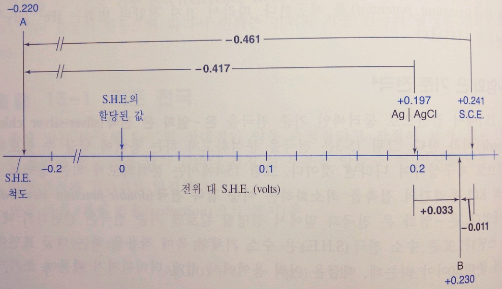 SHE에 대해 -0.220V인 A점은 SCE에 대해 -0.461V (= -0.22 - (0.241-0) ), 은-염화은 전극에 대해 -0.417V (= -0.22 - (0.197-0) )