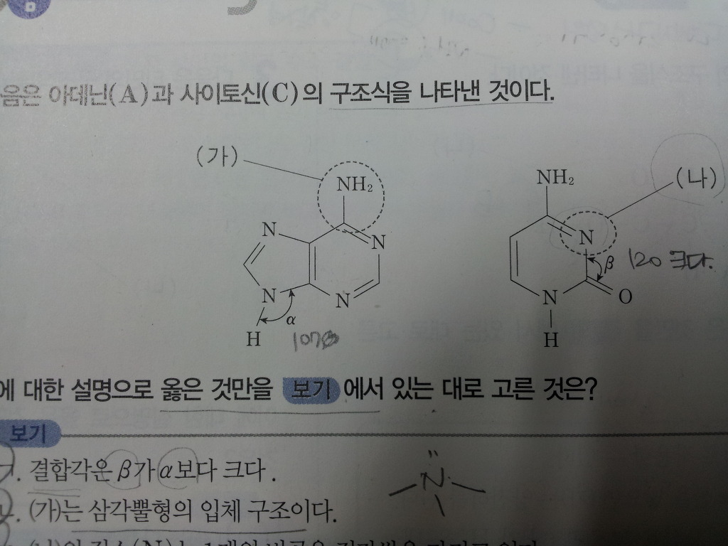 그런데 이문제의 해설에서는 a의 질소는 비공유전사쌍이 존재하는 때문에 암모니아 비슷한 삼각뿔 모양을 하고 있다네요~~~그래서 결합각인 약 107도 된다고 하는데...