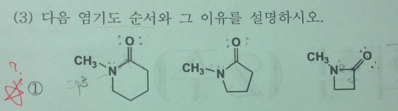 답에는 간단하게 '고리의 탄소원자는 고리 밖의 산소원자에 대해 강한 s 성질로 작용한다. 따라서 고리 내부의 크기가 감소할수록 약 염기이다' 라고만 나와있네요.ㅠ