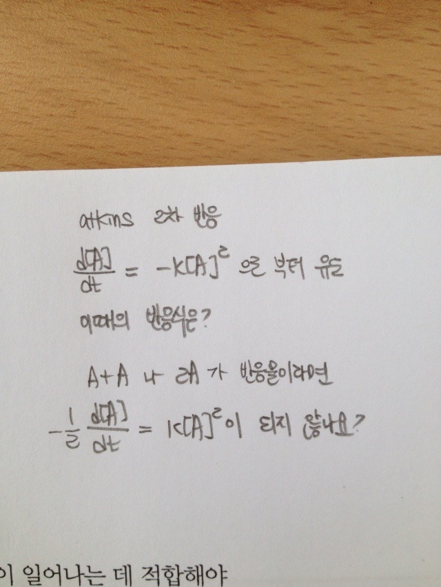 위의 사진에 써 있는 그대로 입니다. 엣킨스에 나와있는 반응식은 계수 2가 붙어 있지 않은데요... 엣킨스에 나와있는 반응속도를 쓰려면 화학반응식이 어떻게 되어야 할까요? 그리고 A+A도 2A와 같은 반응물로 보아도 되는 것인가요?