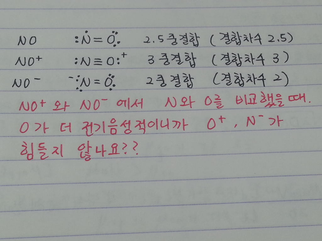 [무기화학]NO, NO+, NO-의 루이스구조 작성자바로크|작성시간14.05.21|조회수6,886 목록 댓글 2 글자크기 작게가 글자크기 크게가 사진에 질문있습니다 다음검색 현재 게시글 추가 기능 열기 북마크 공유하기 신고 센터로 신고 댓글 댓글 2 댓글쓰기 답글쓰기 댓글 리스트 작성자keunjoong77 | 작성시간 14.05.21 NO+의 경우 결합에공유전자쌍하나를 산소의 비공유전자쌍으로 주면 해결될것같지만 그것보다 결합수 많은게 형식전하분포보다 에너지적으로 안정화시키는 우선순위라서 저렇게 표현되는거 아닐까요? NO-의경우는 O에 음전하를 줄수있는 기여구조가 없어서 저렇게표현되는거아닐까요? 답댓글 작성자바로크 작성자 본인 여부 작성자 | 작성시간 14.05.21 질문 올려놓고 기여도가 생각났어요 ㅎ답변 감사해요 ^^ 댓글 전체보기