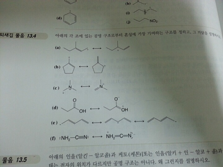 이문제에서 (e)에서 가운대 구조가 가장 공명 구조에서 혼성에 가장 기여한다고 되어있는데, (2차 탄소양이온이라서)