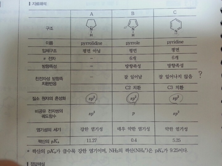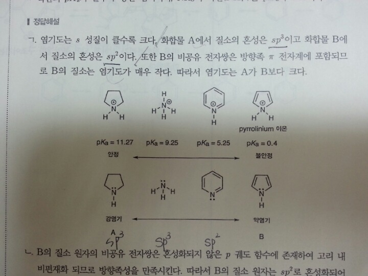 해설을 보면 염기도는 s성질이 클수록 크다라고 되어있는데, A에서 질소의 혼성이 sp3이고 B에서 질소의 혼성은 sp2라면 염기도늠 B가 더 커야하는거아닌가요....? 뒤에 비공유전자쌍때문에 염기도순서가 바뀐건가요?? 설명이 헷갈리게 하네요 ㅜㅜ