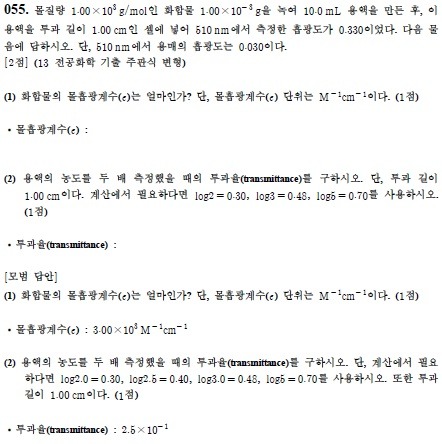 [분석화학]분석화학 흡광도 투과율 관련문제 질문입니다 작성자똘망똘망|작성시간15.11.17|조회수1,090 목록 댓글 3 글자크기 작게가 글자크기 크게가 몰 흡광계수는 구했는데요 용액의 농도가 2배일때 투과율구하는 결과값이 계속 틀려서 풀이방법좀 알려주시면 감사하겠습니다 다음검색 현재 게시글 추가 기능 열기 북마크 공유하기 신고 센터로 신고 댓글 댓글 3 댓글쓰기 답글쓰기 댓글 리스트 삭제된 댓글입니다. 답댓글 작성자똘망똘망 작성자 본인 여부 작성자 | 작성시간 15.11.18 그럼 저 때는 용액의 흡광도인 0.330에 2배를 한 값인 0.660으로 계산을 해야되는 건가요? 답댓글 작성자똘망똘망 작성자 본인 여부 작성자 | 작성시간 15.11.18 헬륨 감사합니다 로그계산을 잘못했었네요;; 댓글 전체보기