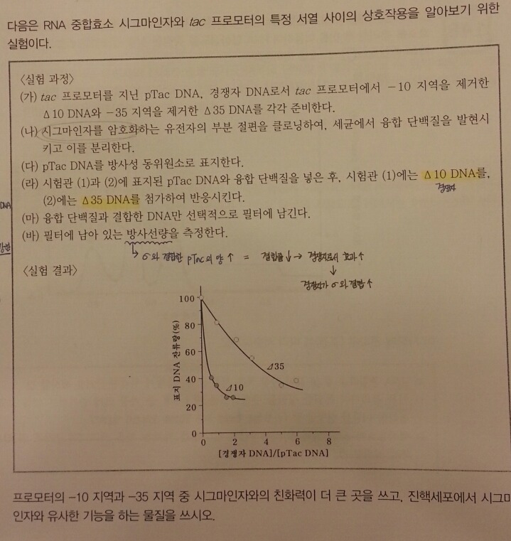 ㄱㅊㅇ 선생님 문풀자료 입니다. 문제이 프로모터의 -10지역과 -35지역 중 시그마인자와의 친화력이 더 큰 곳을 쓰라고 했는데요.