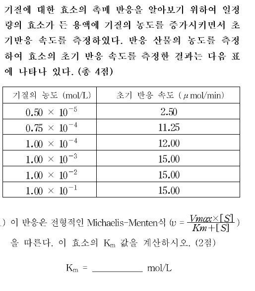 여기서 Vo를 2.5나 11.25, 12중에 아무거나 넣고 그에 대응하는 기질의농도값과 Vmax를 15로 대입해서 계산하면 답이나온다고 하던데 Vo와 Vmax를 15로 넣고 [S]를 1.00X10^-1로 대입하면 Km이 0이되더라고요.