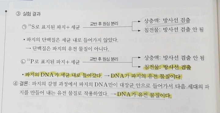 거기서 방사능을 띠는 자손 파지가 생기느냐 아니냐이고, 이로부터 유전물질 여부 판단할 수 있습니다.