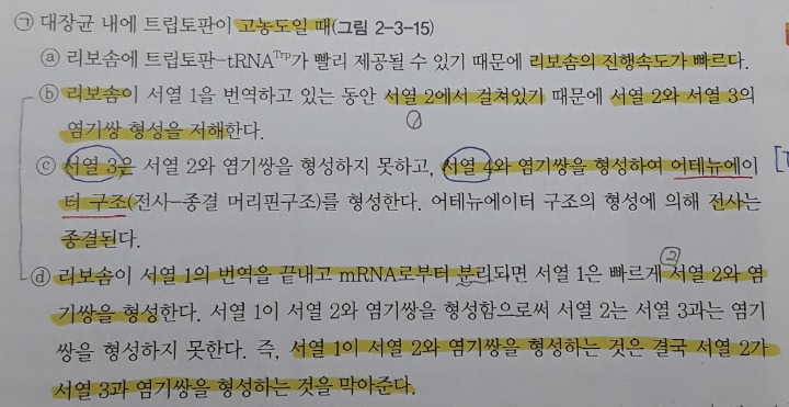 d를 볼 때 '리보솜이 빠르게 분리되어 먼저 서열1과 서열2가 먼저 염기쌍을 형성'하여 서열 2,3 염기쌍형성을 저해, 어테뉴에이터 구조를 형성한다고 보이는데 다른 내용이 아닌가요? 동시에 같은 기작이 일어날수 있는지 모르겠습니다ㅠ