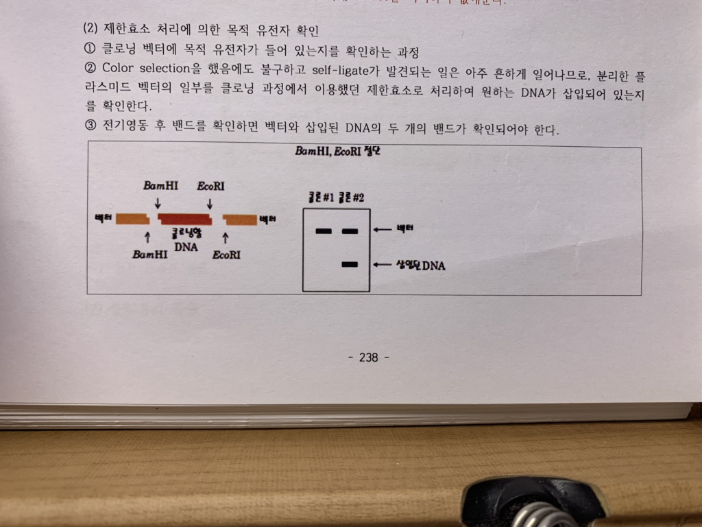 목적유전자 삽입을 위해, 클로닝벡터에ㅜ제한효소를 처리 후 잔기영동 밴드를 확인한다고 하는데