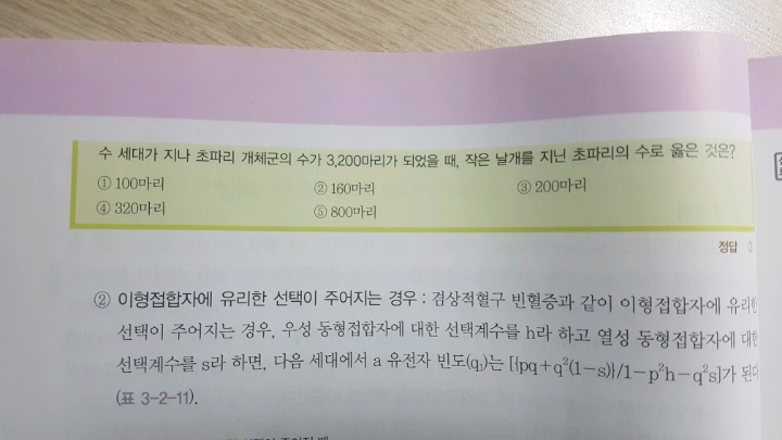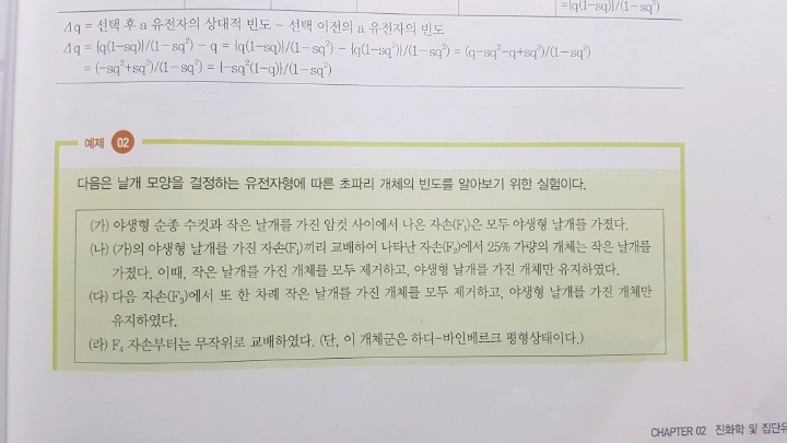 작성자ssen 작성시간 19.04.08 F4부터 무작위교배이므로 대립유전자 빈도가 그대로 유지되므로 작은날개가 나올확률은 1/16 입니다. 초파리개체수 3200 * 1/16 하면 200마리가 나옵니다.