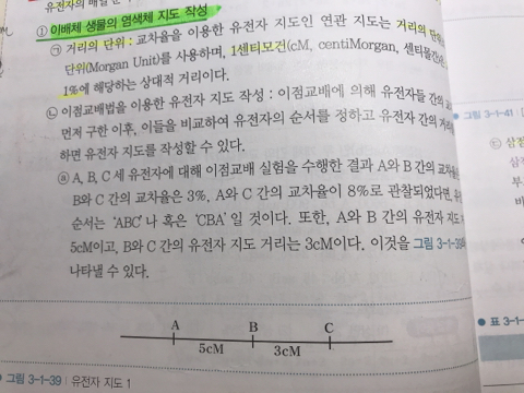 유전자 두 개만 뽑아서 계산하는 거예요. 제시된 유전자가 3개든 4개든 5개든 그 중 두 유전자만 뽑아서 둘 사이의 유전자 거리는 이점교배법으로 구해요.